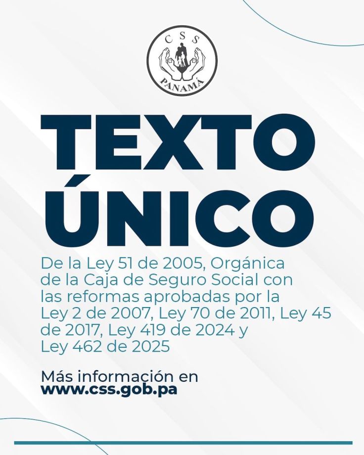 – “La Caja de Seguro Social informa a la ciudadanía en general que ha sido promulgado en la Gaceta Oficial 30284-B el Texto Único de la Ley 51, Orgánica de la CSS, que incorpora las reformas aprobadas mediante la Ley 2 de 2007, Ley 70 de 2011, Ley 45 de 2017, Ley 419 de 2024 y Ley 462 de 2025.