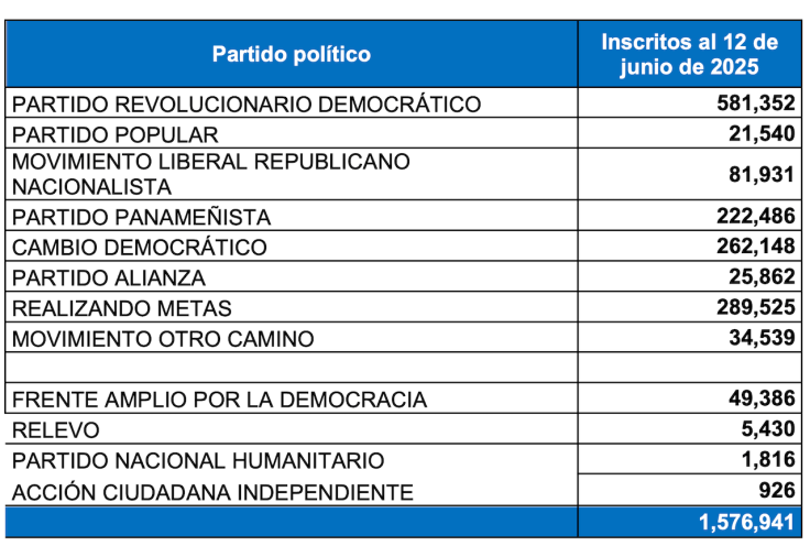 – Hasta el pasado jueves 12 de junio de 2025 a las 11:59 p.m., un total de 1,576,941panameños estaban inscritos en los distintos partidos políticos legalmente constituidos y en formación, revelaron las cifras de la Dirección Nacional de Organización Electoral (DNOE).