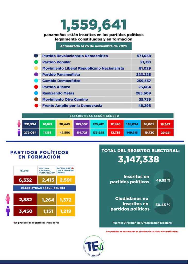 – La inscripción en los diferentes partidos políticos legalmente constituidos y en formación, totalizaba en 1,559,641 panameños, hasta este jueves 26 de noviembre de 2025, según lo reportó la Dirección Nacional de Organización Electoral (DNOE).