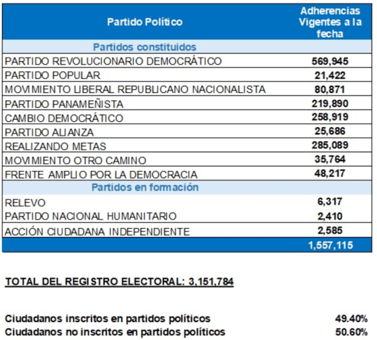 – La Dirección Nacional de Organización Electoral (DNOE) reveló que hasta este viernes 25 de diciembre de 2025 a las 11:59 p.m., un total de 1,557,115 panameños aparecían inscritos en los distintos colectivos políticos legalmente constituidos y en partidos en formación.