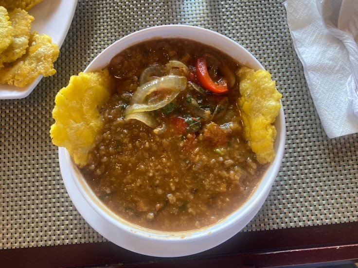 – Allí en El Fogón Criollo tuve la oportunidad de disfrutar un almuerzo riquísimo y tradicional en los fogones chiricanos: guacho de mariscos, con la acostumbrada guarnición de patacones. Una receta completa y totalmente de mi gusto.