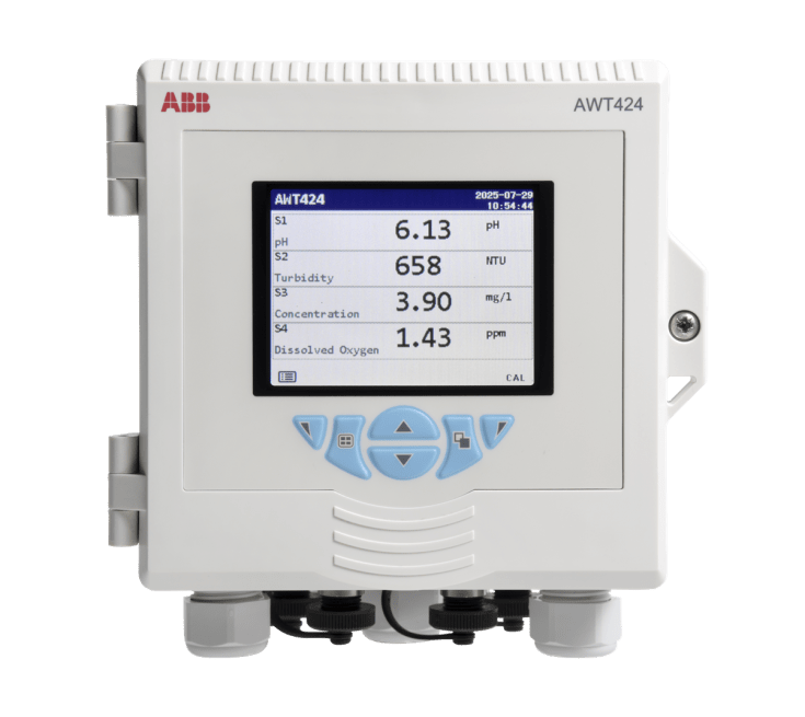 – El transmisor AWT424 de última generación constituye la columna vertebral de la plataforma de análisis continuo del agua de ABB. Diseñado para simplificar y unificar la medición del agua, permite a los operadores conectar y controlar hasta cuatro sensores simultáneamente, de esta forma se tiene una visión completa de la calidad del agua, incluidos parámetros como pH/ORP, conductividad, turbidez, cloro y oxígeno disuelto.