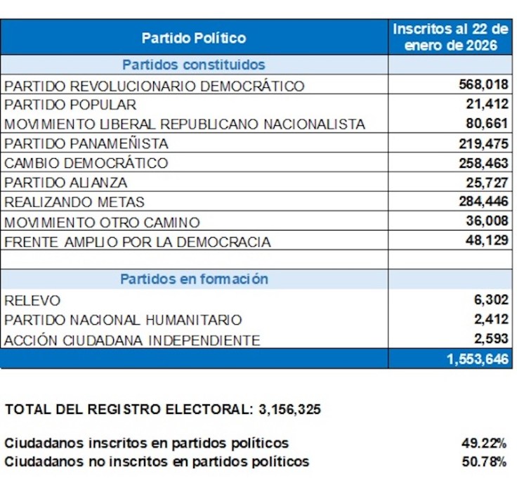 – Un total 1,553,646 panameños aparecían inscritos en los distintos colectivos políticos legalmente constituidos y en partidos en formación, de acuerdo a lo revelado por el más reciente informe de la Dirección Nacional de Organización Electoral (DNOE).