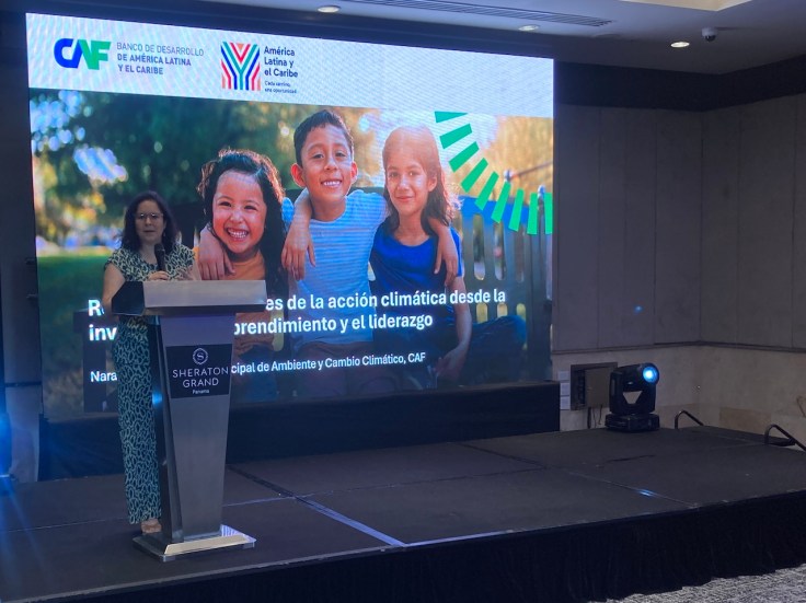 4.- Nara Vargas, especialista de Diversidad y Clima de CAF, disertó acerca de “Retos y oportunidades de la acción climática”; puntualizó en que esta entidad financiera es un banco verde; y advirtió que ninguna transición climática se logrará solamente con el aporte del sector público.