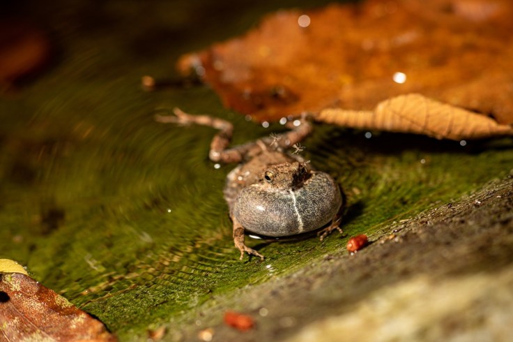 Una rana túngara, cuyo canto de apareamiento se utilizó en el estudio. Su saco vocal se infla para amplificar sus vocalizaciones. (Foto, Steven Paton).