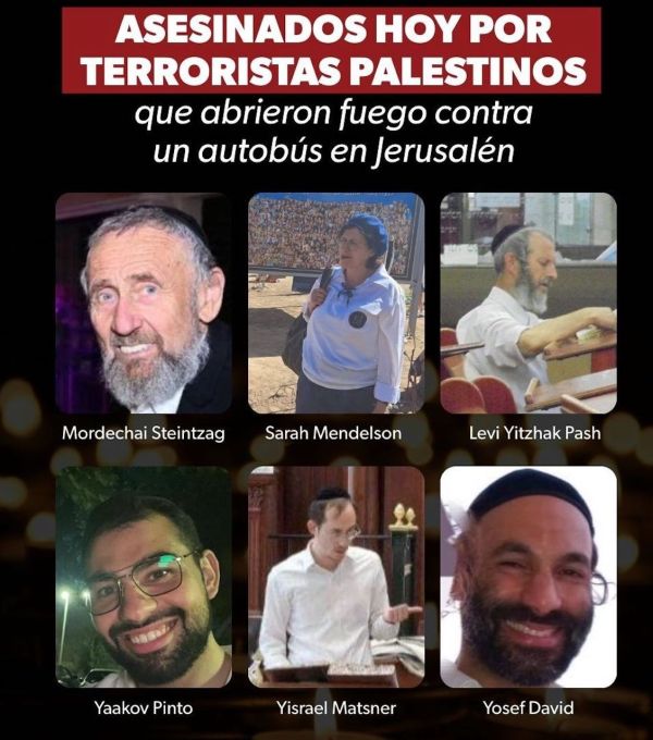 Las víctimas fatales del atentado: Mordechai Steintzag, Sarah Mendelson, Levi Yitzhak Pash, Yaakov Pinto, Yisrael Matsner y Josef David. (Foto, Embajada de Israel). Colaboración de la Embajada de Israel - La mañana de este lunes 8 de septiembre de 2025, recibimos el siguiente comunicado, relativo al atentado perpetrado por “terroristas palestinos” y que tuvo un... Leer más →