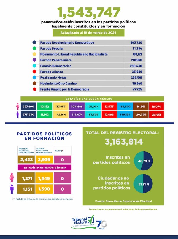 Resultados de las inscripciones de los ciudadanos en los partidos políticos legalmente constituidos y en formación. (Gráfica, Tribunal Electoral). Colaboración del Tribunal Electoral - Al jueves 19 de marzo de 2026, el total de ciudadanos inscritos en los partidos políticos legalmente constituidos y en formación ascendía a 1,543,747, cifra representaba una disminución de 12,805 afiliados en... Leer más →